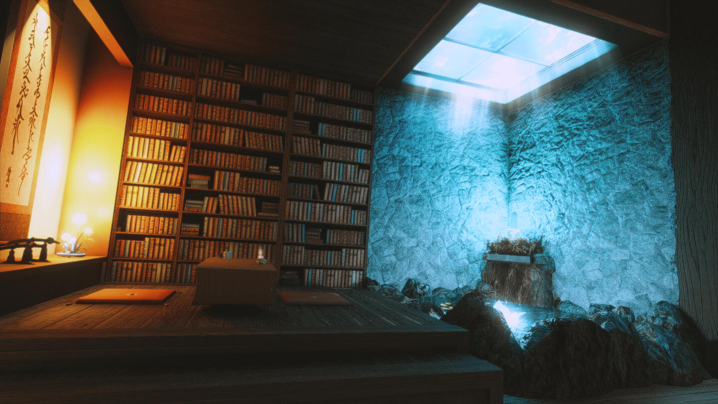 My personal room combines some Japanese elements like the futon and onsen with modern elements to create a lazy bar atmosphere.