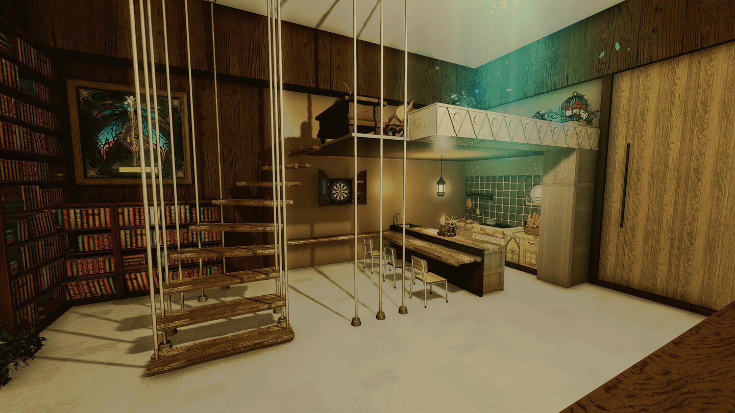 Korny Lovecorn requested a Scandinavian style apartment. This was an early build (no minimalistic) plus it's Mist so I got creative when hiding the pillars and windows by creating a recessed display shelf. The open kitchen right next to the living room hopefully doesn't cause a fire when the cook is too distracted by the TV. Approved by Godbert Manderville.